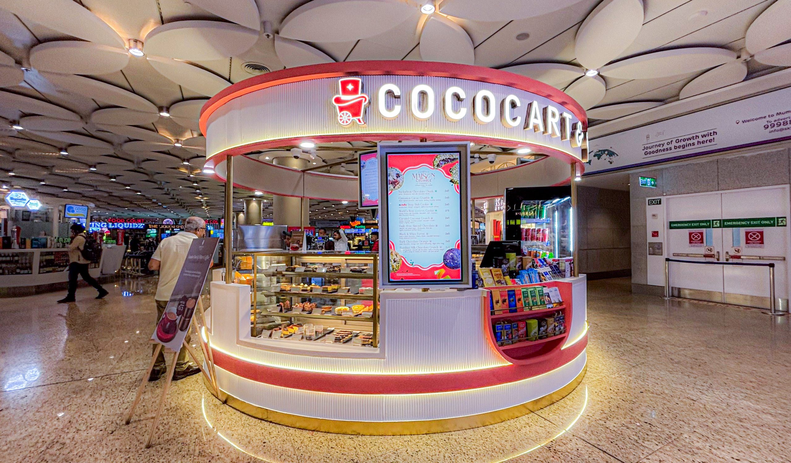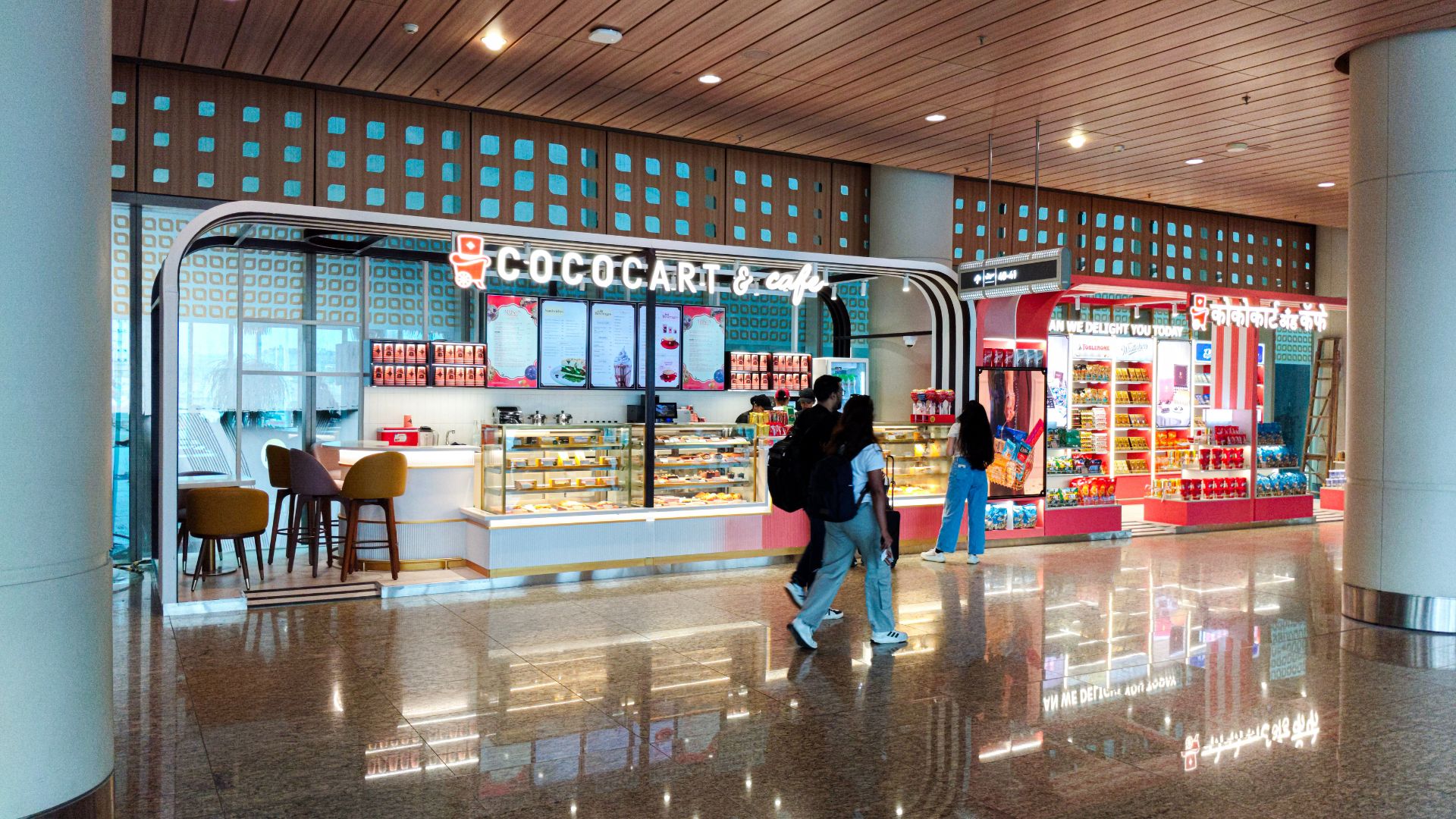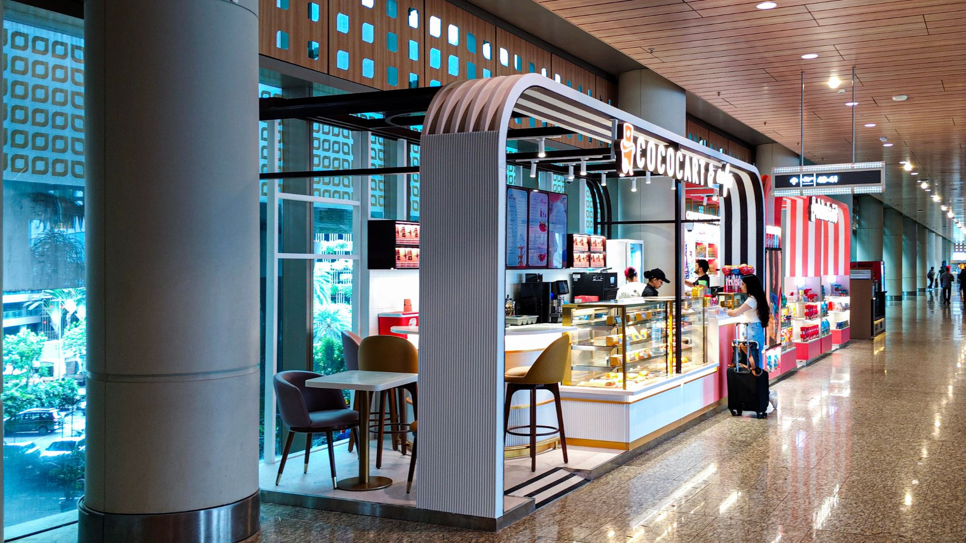 This airport kiosk interior design brings warmth and motion to Terminal 2’s sleek expanse—inviting travellers in from every direction.