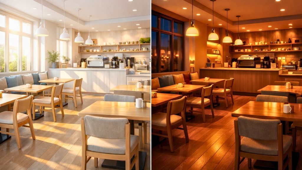 Lighting has to work across 12 hours. Morning meetings need clarity. Evening dates need warmth. The same overhead lights won’t cut it. Layered lighting – ambient, accent, feature – means your space adapts instead of compromises.