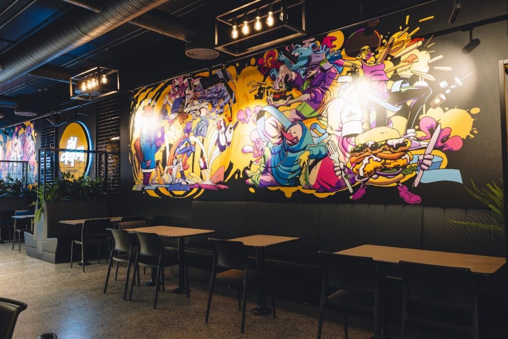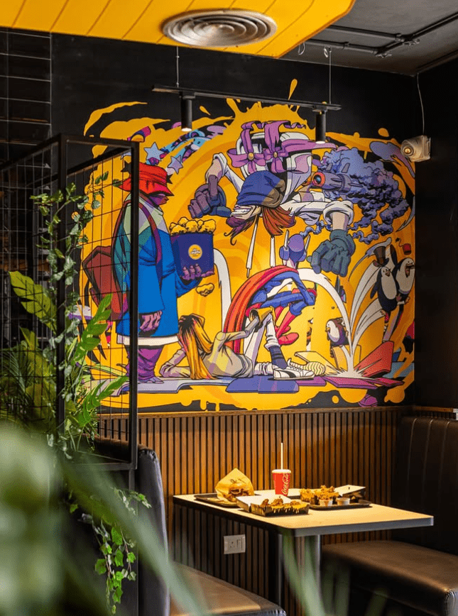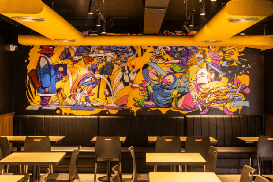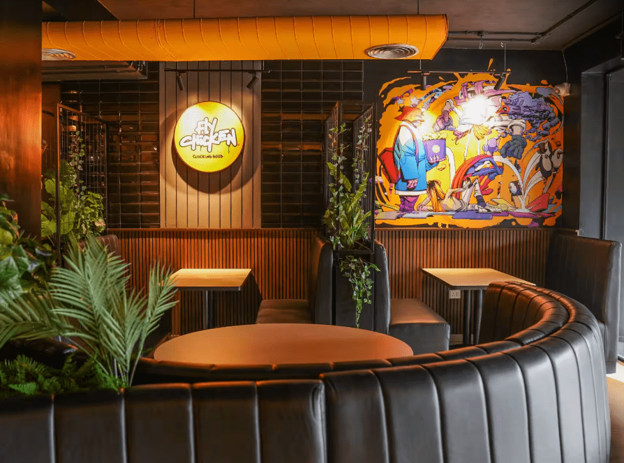 Think graffiti-style graphics, neon signage, and rebellious design edges that mirror Fly Chicken’s menu—wild, indulgent, and made to be devoured.