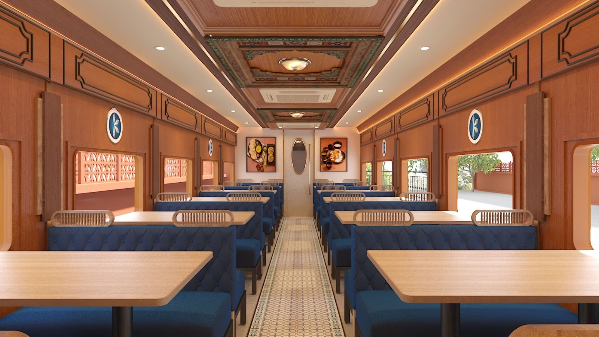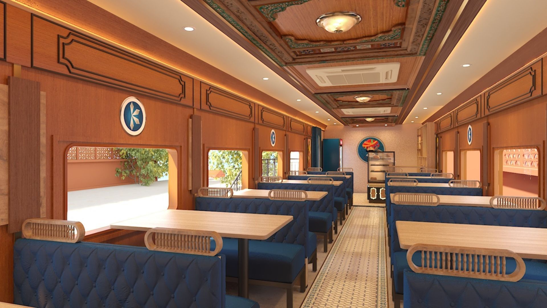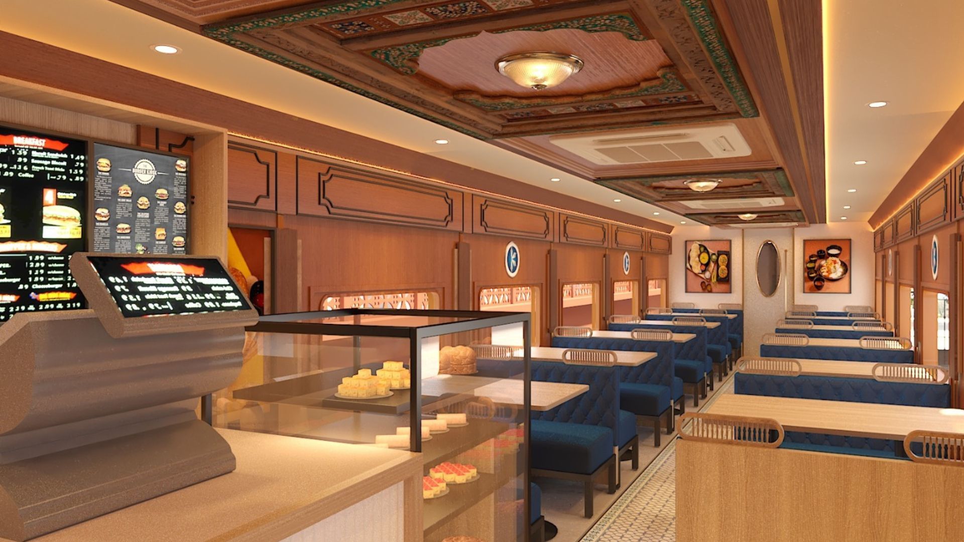 Inside, carved wooden panels, heritage-inspired tiles, and mosaic-printed cement floors recreate the charm of Rajasthan, while smart AC routing and tuned aisle widths make the compact space remarkably efficient.