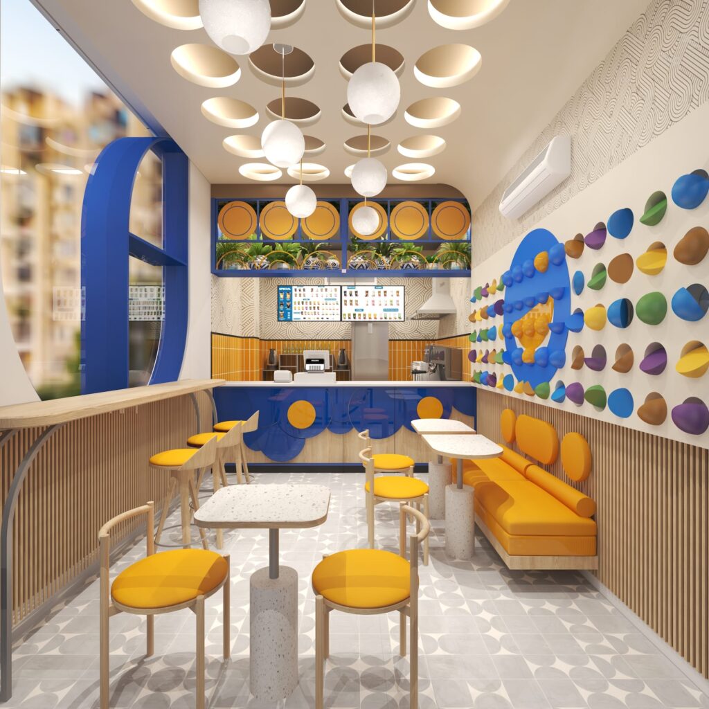 Rounded forms, organic curves, and soft edges shape a space that feels light, lively, and full of joy.